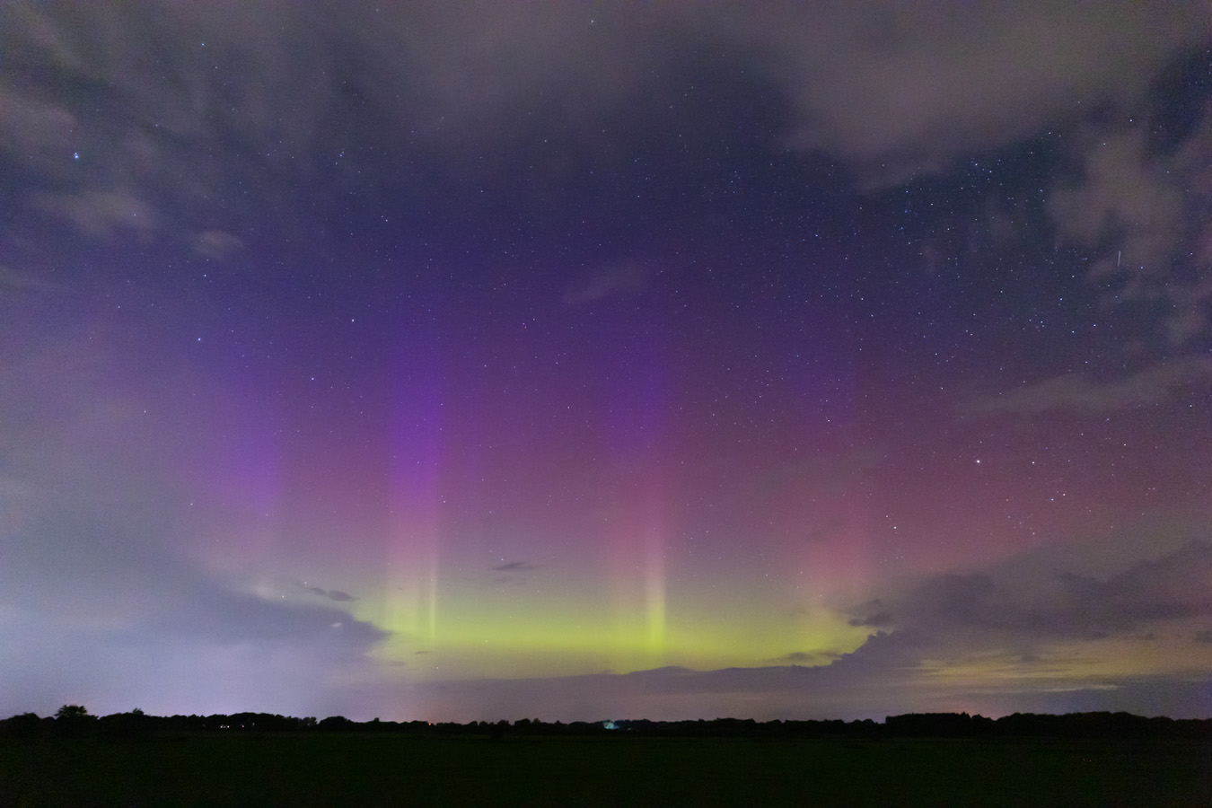 Gegen 21:20 Uhr ein erstes Foto von einem herrlich bunten Nachthimmel gemacht. Mit bloßem Auge war eine Aufhellung am Horizont zu sehen. Bis 22:20 würde die Aufhellung intensiver und zum Höhepunkt waren Beamer zu sehen, ebenso die Farben waren schwach erkennbar. Glück war, dass zum entscheidenden Moment die Wolkendecke auflockerte und abzog. In der Ferne konnte ich die Gewitterfront ebenfalls sehen.