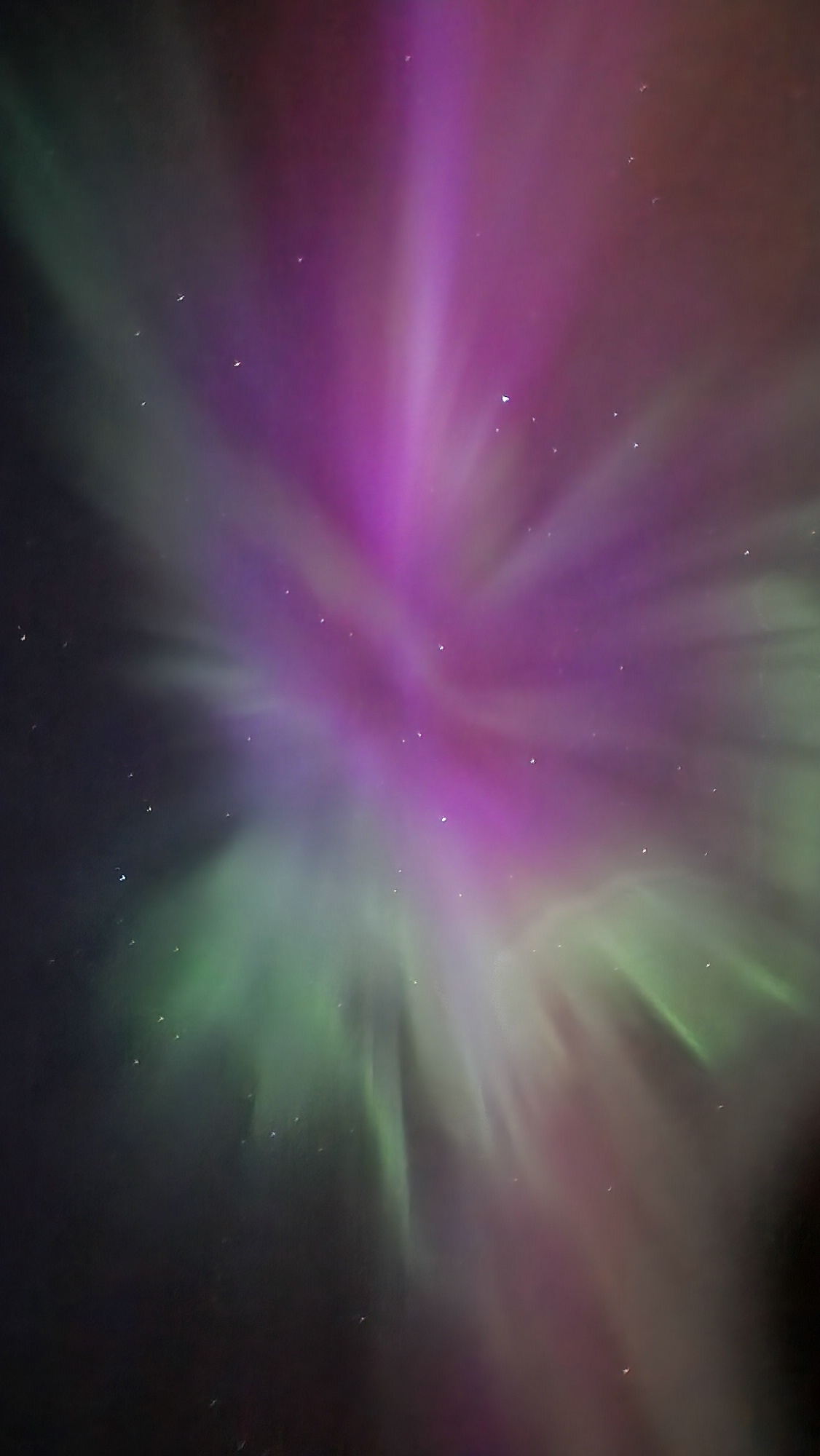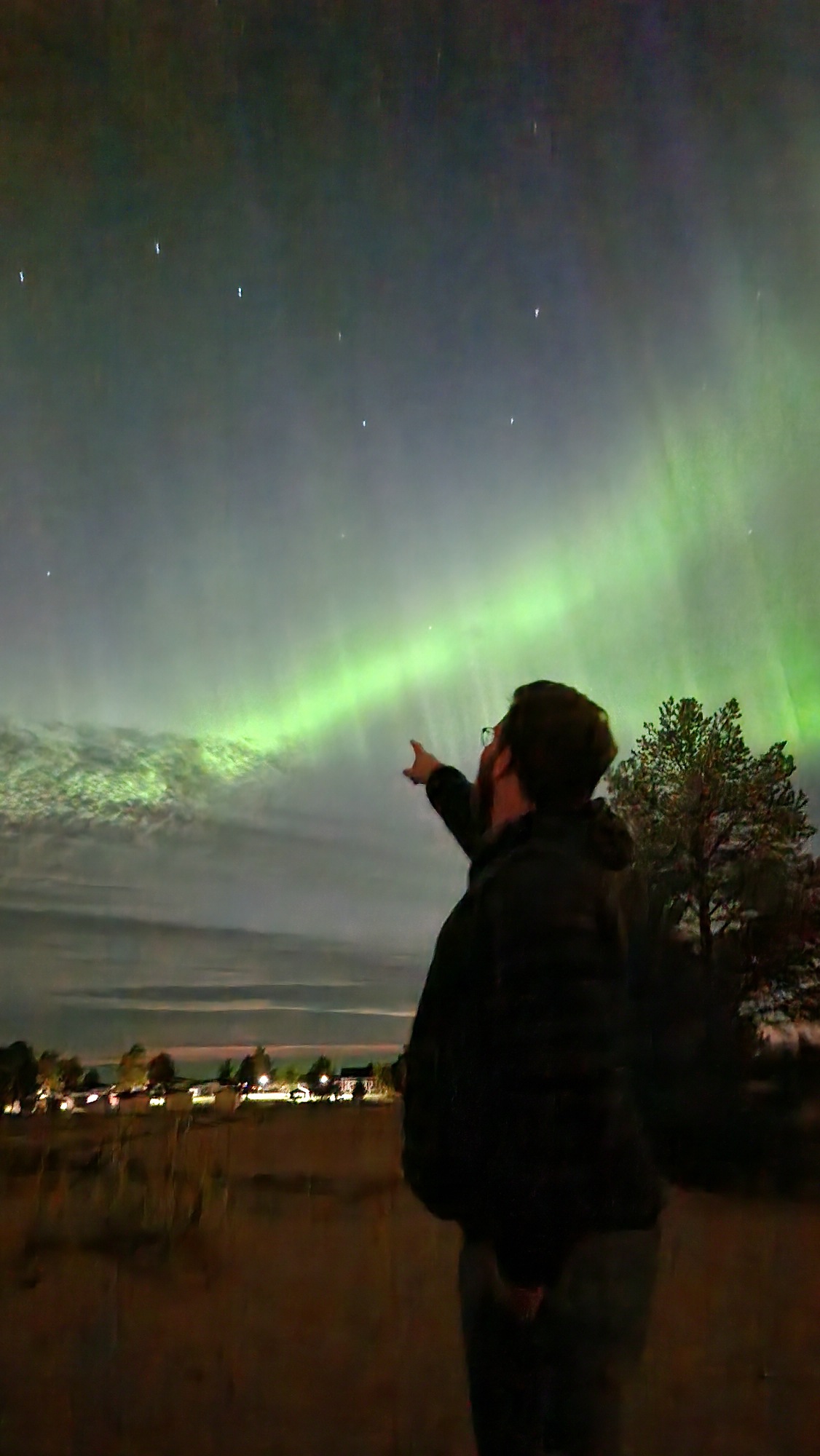 Habe aber den ersten Zeitpunkt verpasst, weil ich bis 20h im Baumarkt war, dann das Fahrrad beladen habe und zu Fuß zu einem weiteren Geschäft geschoben habe. Von dort bin ich dann ca. 22 Uhr wieder zu Fuß Richtung Wohnung gelaufen. Als freier Blick nach Norden war, habe ich durch die Handykamera geschaut, weil graue Streifen am Himmel zu sehen waren, sahen aber wie dünne Wolkenstreifen aus. Es wurde beim Blick aufs Display auch nicht farblich, denn ich hatte um ca. 18h auf dem PC gesehen, dass es abends evtl. Polarlicht geben könnte, aber ob bis GÖ?