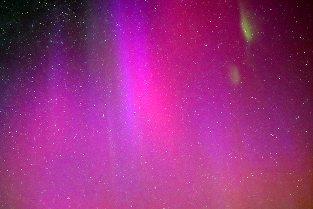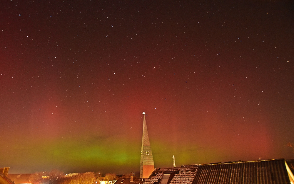 Hinweisen möchte ich auf ein angehängtes Bild von ca. 18:40h MEZ, welches ich extrem bearbeitet habe um eine Bedonderheit herauszuarbeiten: Es handelt sich um die grünen Punkte, rechts im Bild.