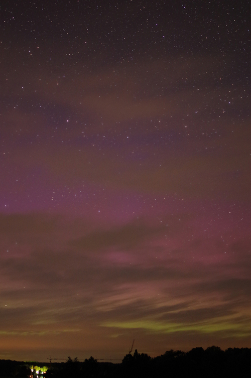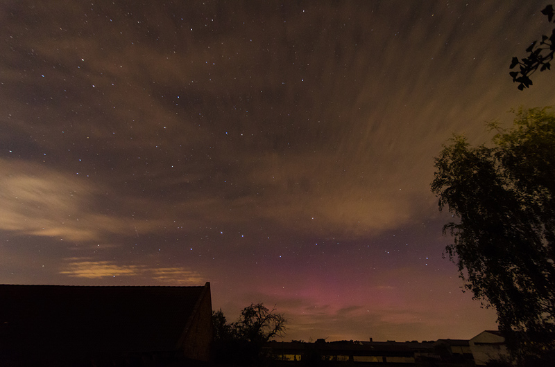 In der Zeit von 21:30 bis 23:30 habe ich durchgehend (so die Wolken es zuließen) den grünen Bogen und darüber rot-violettes Glühen auf dem Chip. Gelegentlich sind durch die Wolkenlücken Beamer zu erahnen. Die Helligkeit würde ich als schwach visuell einstufen, ohne Wolken wäre vermutlich mehr drin gewesen.