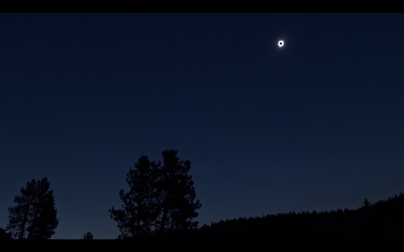 ich habe die gestrige Sonnenfinsternis zusammen mit 150 Mitreisenden aus dem deutschsprachigen Raum bei der Winedown Range nahe Prineville/Oregon unter besten Bedingungen beobachtet. Nachstehend 2 Frames aus einem Video und eine Aufnahme vom Beobachtungsort etwa 5 Minuten nach Ende der Totalität.