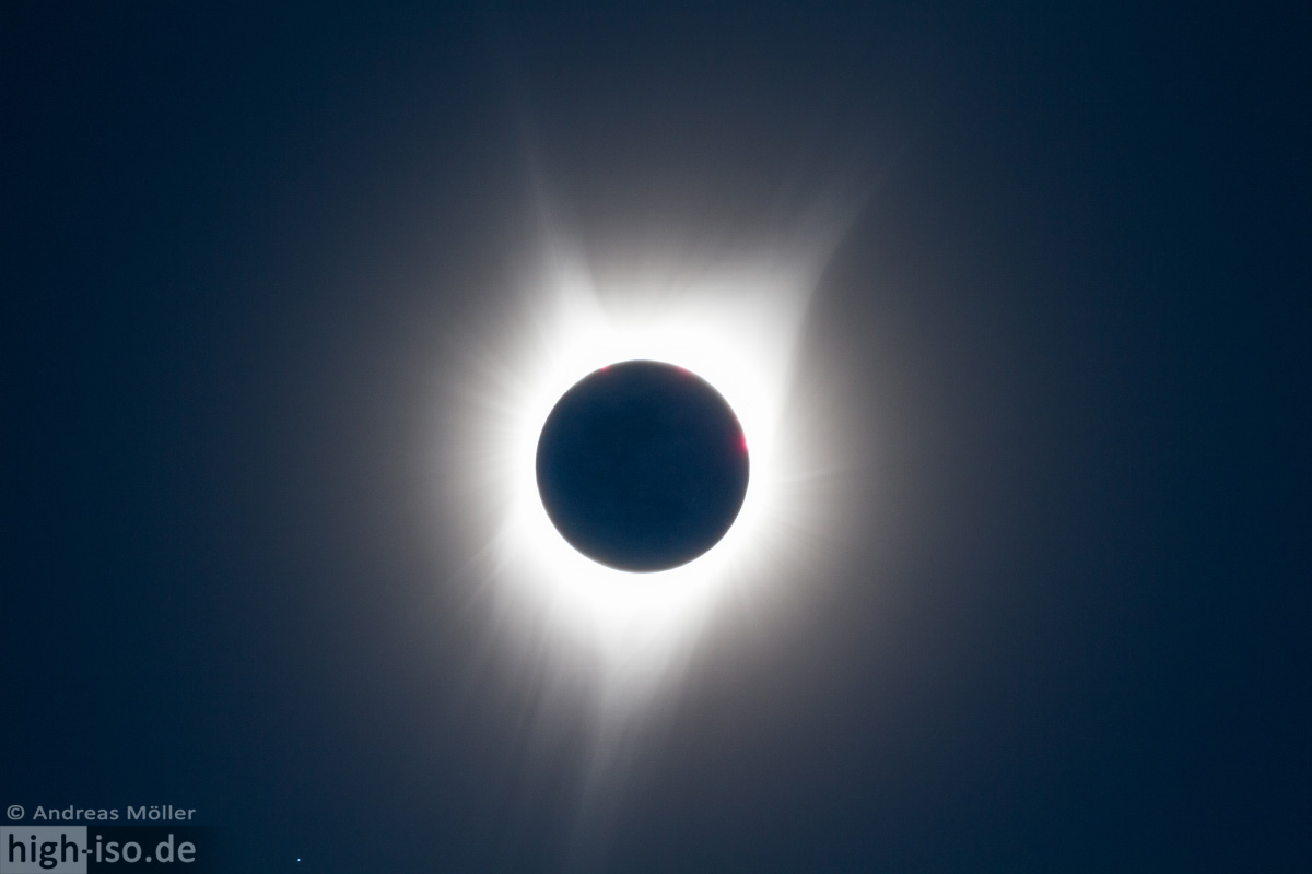 Glückwunsch an alle erfolgreichen SoFi-Jägern! Ja, Andreas, die erste Totale flashed ungemein. Die richtig sichtbare Totale für mich war am 20. März 2015 bei einem Sonnenfinsternisflug über die Färöer-Inseln. Das war so fantastisch. Die totale Sonnenfinsternis 1999 wurde durch Wolken gestört. Pünktlich zur Totalität hatten sich dicke Regenwolken vor die Hauptakteure geschoben. Wir sahen nur wie es dunkel wurde und die Natur einschlief, was auch schon beeindruckend war. Aber das Non Plus Ultra war 2015. Ja, ich ärgere mich, angesichts der tollen Bilder und Erlebnisberichte, auch darüber, dass ich nicht in die USA gereist war. Na ja, vielleicht 2024 oder sonst 2026/2027 Spanien.