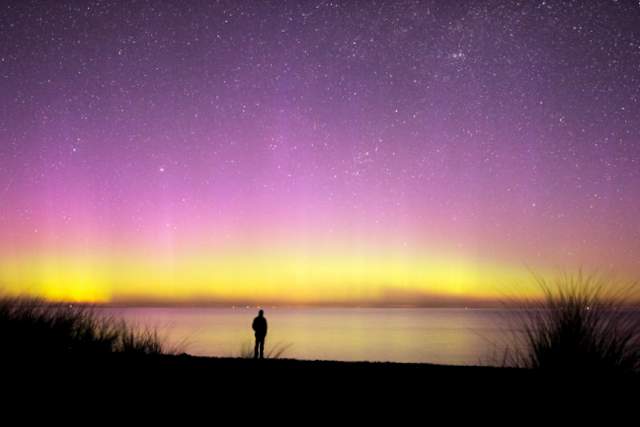 Fotografisch kurzfristig ein grüner Bogen zu erahnen, violetter Bogen an- und abschwellend fotografisch dauerhaft nachweisbar.