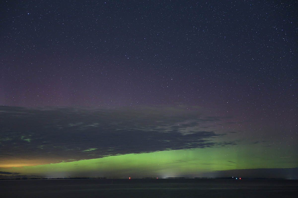 Das Nordlicht war visuell nicht nur als Aufhellung sichtbar, sondern leuchtete auch deutlich grün, den in den Fotos ebenfalls sichtbaren rote Anteil oberhalb der Wolken konnte ich aber mit bloßem Auge nicht wahrnehmen.