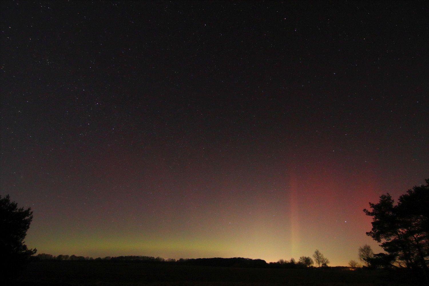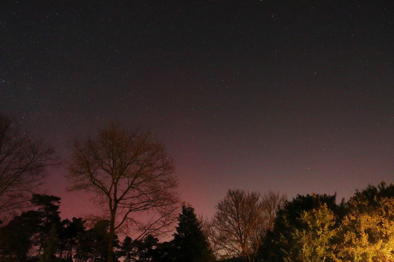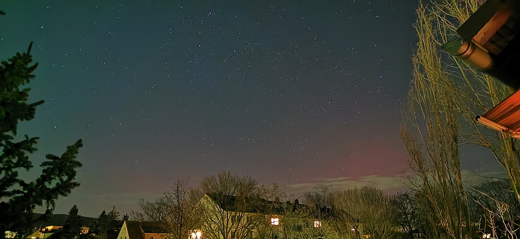 Ein Foto im Garten zeigte dann um 22:27 MEZ rotes Polarlicht. Dies war nur fotografisch, da es einfach zu hell in der Umgebung war.