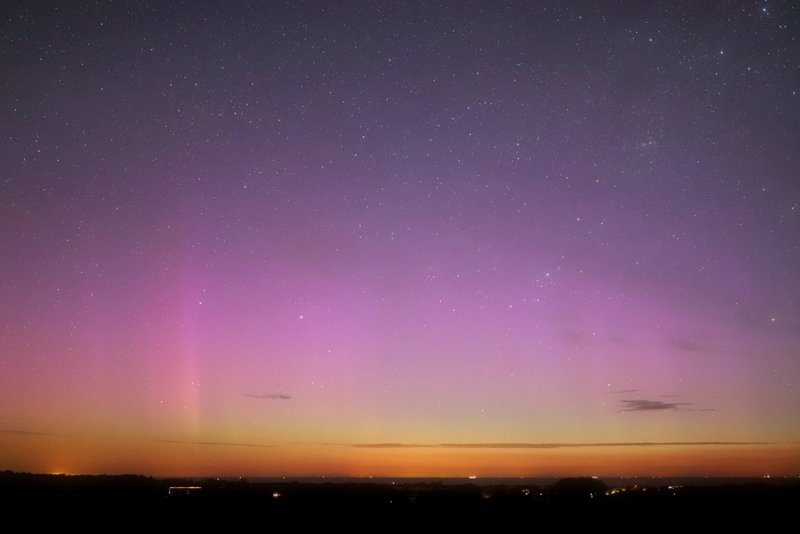 Das kam aber unerwartet. Als der Bz-Wert am DSCOVR kurzzeitig Richtung minus 10 nT rutschte, habe ich mich auf den Weg gemacht. Der Höhepunkt waren sehr scharfe Beamer um 00:09 UTC, die den vorher schon festgestellten „deutlich visuellen“ Helligkeitseindruck voll bestätigten, und fast in die Kategorie „hell“ rutschten. Um 00:41 UTC habe ich abgebrochen, obwohl das PL im NW noch fotografisch war. Von Osten kam aber die Dämmerung schnell näher.