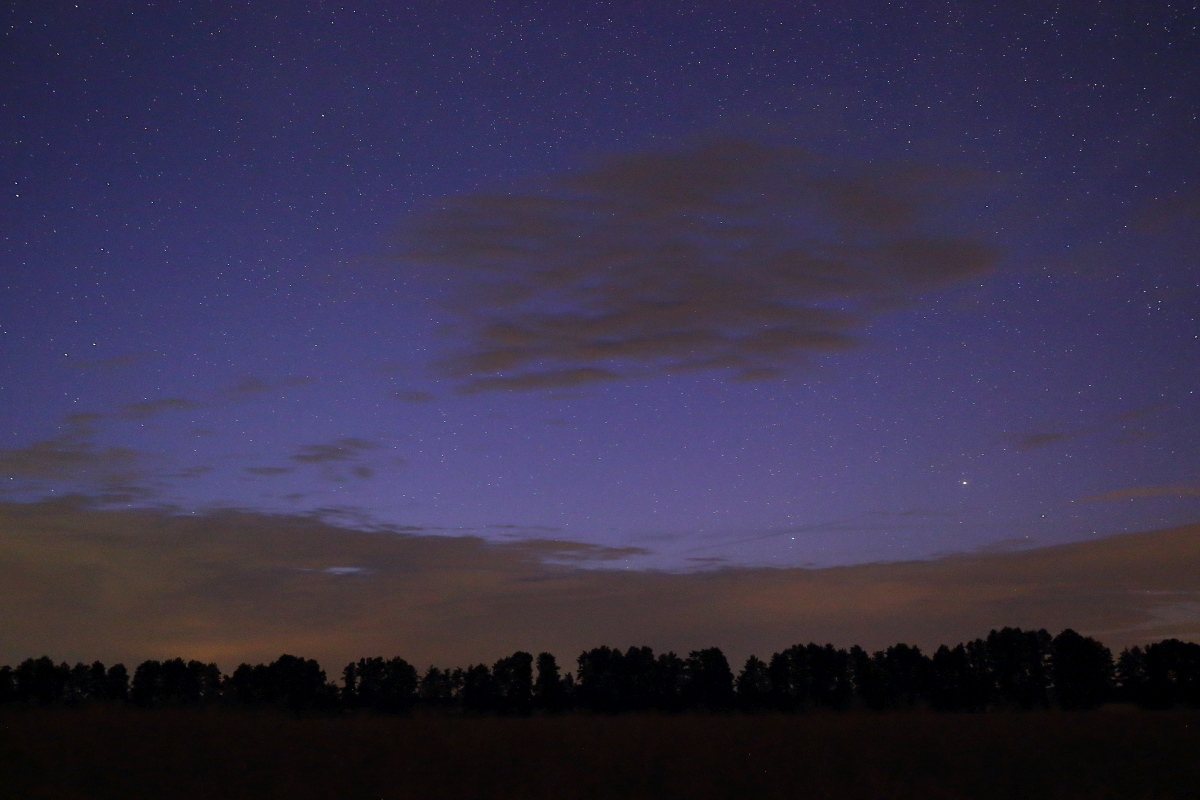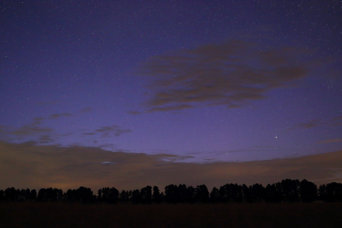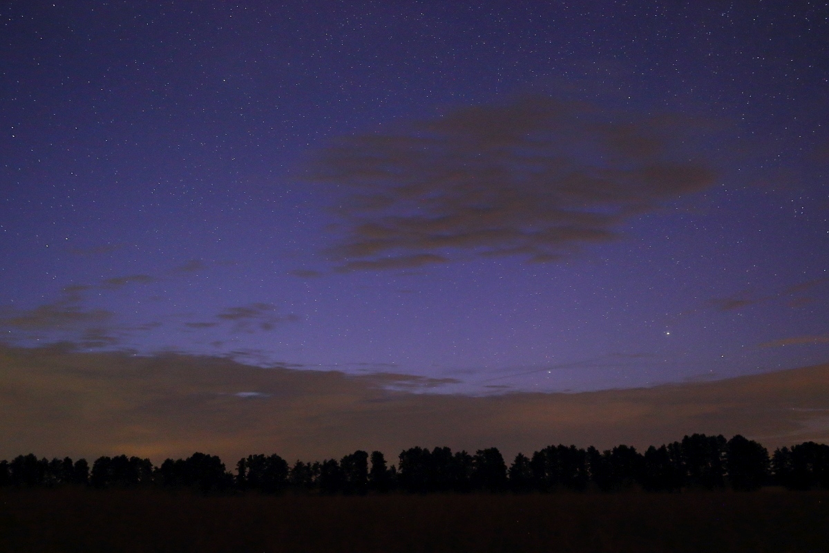 Von meinem Standort bei Natho in Sachsen-Anhalt (51.96N, 12.21E) ließ sich gestern kurzzeitig schwache Polarlichtaktivität (ausschließlich) fotografisch nachweisen. Leider waren die äußeren Bedingungen schlechter als erwartet und die Aktivität schwächer als erhofft. Der avisierte G1-Sturm blieb aus, die stärkeren Aktivitätsphasen endeten bereits kurz nach Sonnenuntergang. Dabei beeinflusste vor allem der Durchzug mehrerer Wolkenfelder in unterschiedlichen Höhenlagen die Transparenz erheblich. Das hatte ich mir zugegebenermaßen etwas anders vorgestellt. Aber die Polarlicht"jagd" ist wie die nach NLCs nun mal kein Wunschkonzert, sondern ein Naturerlebnis. Und das soll auch so bleiben. Am besten erkennen lässt sich der "Höhepunkt" einer Aktivitätsphase gegen Mitternacht auf dem Frame um 00:14:58 MESZ im Bereich Menkalinan (Fuhrmann) noch durch das Durchklicken aller 6 Frames: