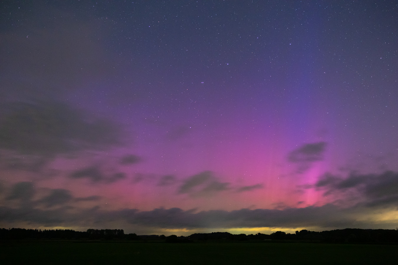 Wolken zogen durch. Zunächst schwach visuelles Polarlicht mit violetten Beamern, dann Steigerung der Intensität innerhalb einer Stunde auf deutlich visuell. Dann war fotografisch auch blaue Spitzen auf den Beamern erkennbar.