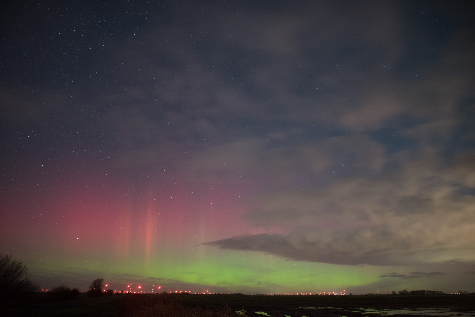 Auch bei Lübbecke (ca. 52.3°N) war das Polarlicht nachzuweisen (mindestens fotografisch), es zeigte sich auf meinen "vernebelten" (und automatisierten) Aufnahmen durch einen immer deutlicher werdenden grünen Bogen, sowie ab ca. 00:20 MEZ (bis 00:30 MEZ) mit diffus roten Flächen und Strahlen.
