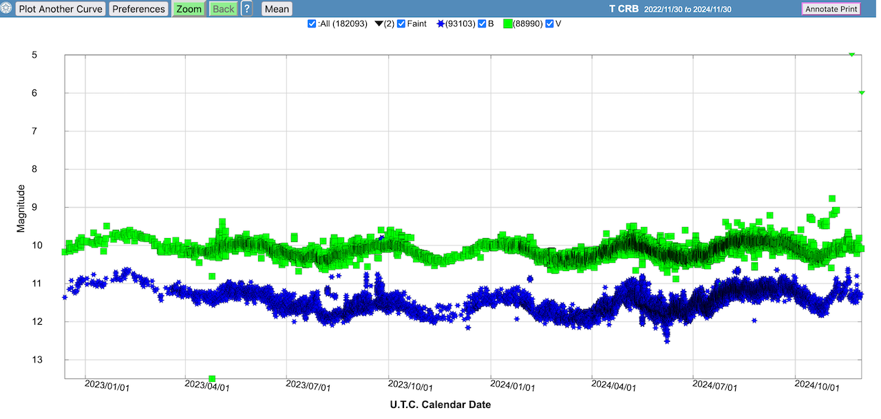 Noch ist der Stern ruhig; und mann kann die Entwicklung hier verfolgen: https://www.aavso.org/LCGv2/. In "Star Name" schlicht "T CrB" eingeben (die grünen Rechtecke zeigen die V mag = visuelle Helligkeit an). Da habe ich gerade gesehen, dass sich der Trend nicht fortgesetzt hat, sondern der Stern vielmehr wieder in seiner normalen Helligkeit in etwa 110 Tagen sehr schön pulsiert. Dennoch lohnt es sich, in jeder klaren Nacht mal in den Sternenhimmel zu gucken...