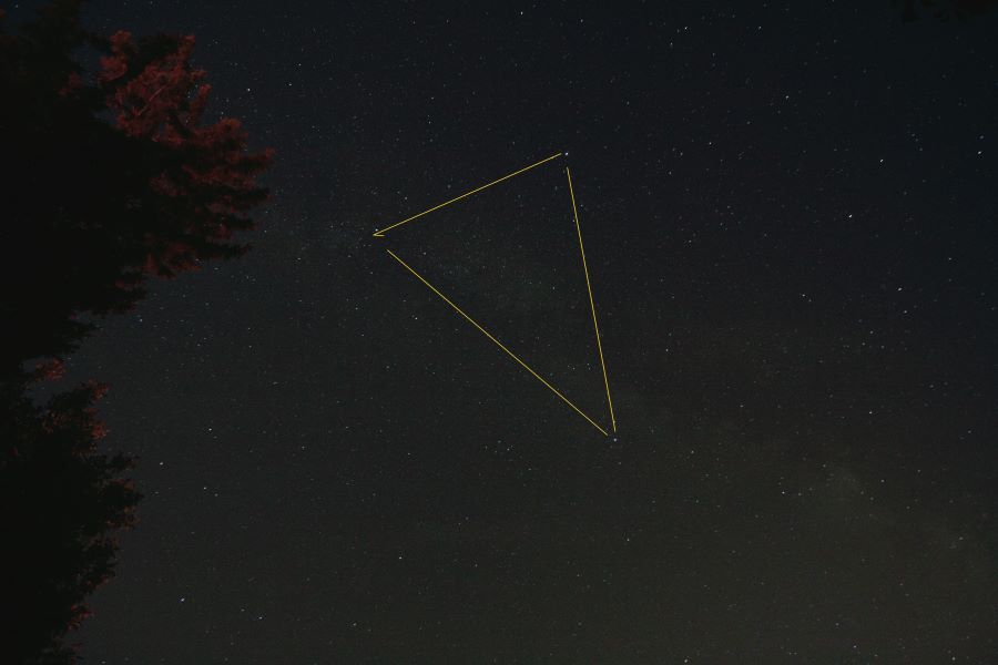 Gestern so gegen 23h nahm ich mit 30s Belichtungszeit und ISO 800 das Sommerdreieck auf, welches hoch oben im Zenit stand. Die Milchstrasse auf diesem Foto sieht man ja irgendwie noch, aber ohne Kamera hätte sie einer, der sich nicht auskennt, kaum wahrgenommen. Das Seeing bei dieser kochenden Atmosphäre ist auch nicht besonders gut, es war absolut windstill und eine tropische Nacht.