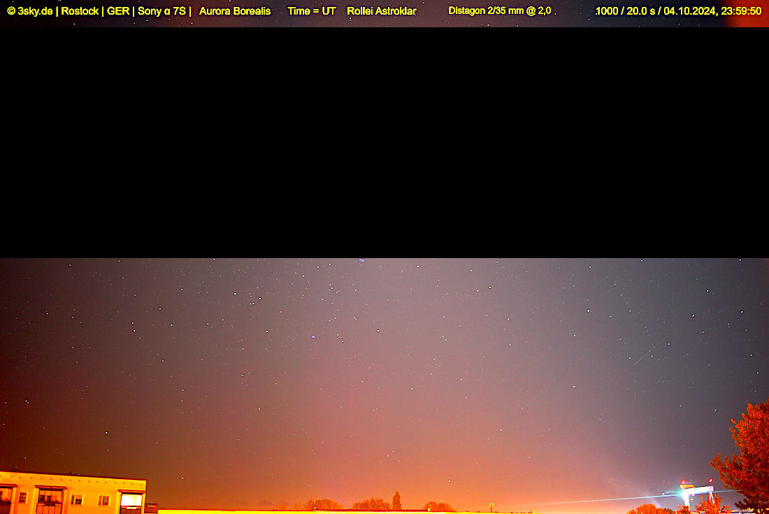 Kommentar: Ich hatte in dieser äußerst klaren Nacht Sterne direkt über dem Horizont beobachten können, desweiteren habe ich vor Sonnenuntergang in Delphinemünde schon eine außergewöhnliche Klarsicht beobachten können. Leider gab es keine Sichtung der Aurora und somit konnte ich nur 2 einigermaßen nennenswerten Aufnahmen machen mit kleinen Beamern. Eine Aufnahme ist von 22:39 Uhr und die Zweite ist von 00:05 Uhr MESZ.