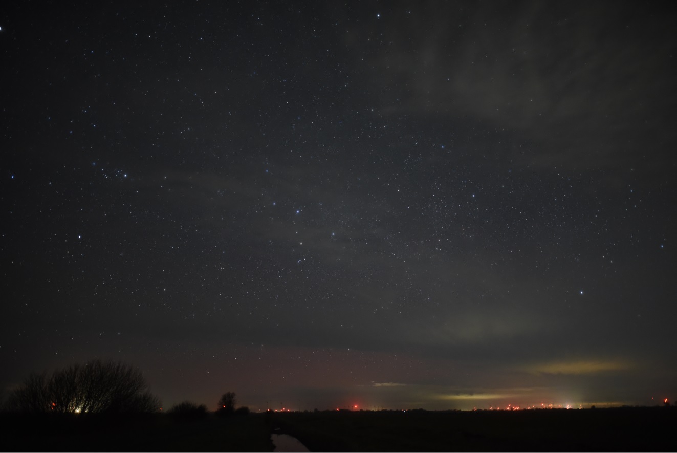 Wie ich erst am PC feststelle, hatte ich schon um 01:21 UTC einen ersten leisen roten Schimmer auf dem Bild. Dabei stand ich an meinen bevorzugten Beobachtungsplatz. Da ich zu dieser Zeit nur alle paar Minuten ein Kontrollbild machte, habe ich nicht den schnell heranziehenden Bodennebel bemerkt. Ohne Sicht habe ich dann die Chancen neu bewertet. Zu gleicher Zeit bewegten sich auf dem MAG Rørvik die Graphen zum erstem mal etwas deutlicher. Statt nach Hause zu fahren, fuhr ich 2 km in die entgegengesetzte Richtung und stellte die Kamera um 01:50 UTC auf dem Nordseedeich auf.