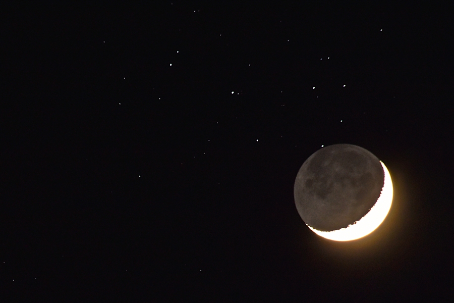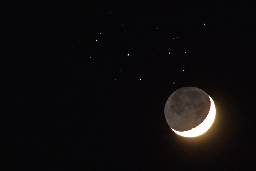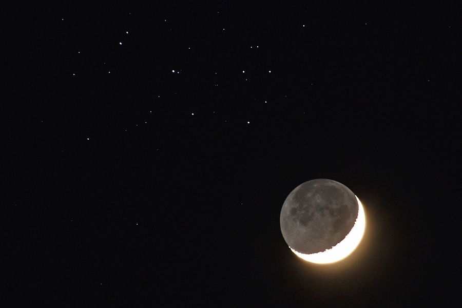 Hier zwei Bilder von dem Abend. Zuerst vom frühen Abend, als noch ordentlich Platz zwischen Mond und Plejaden war: