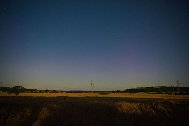 gerade noch mal die Bilder der letzten Nacht durchgeschaut und tatsächlich trotz des hellen Mondlichtes noch etwas entdeckt. Schwache violette Strahlen und Flächen in der rechten Bildhälfte über dem Mais.