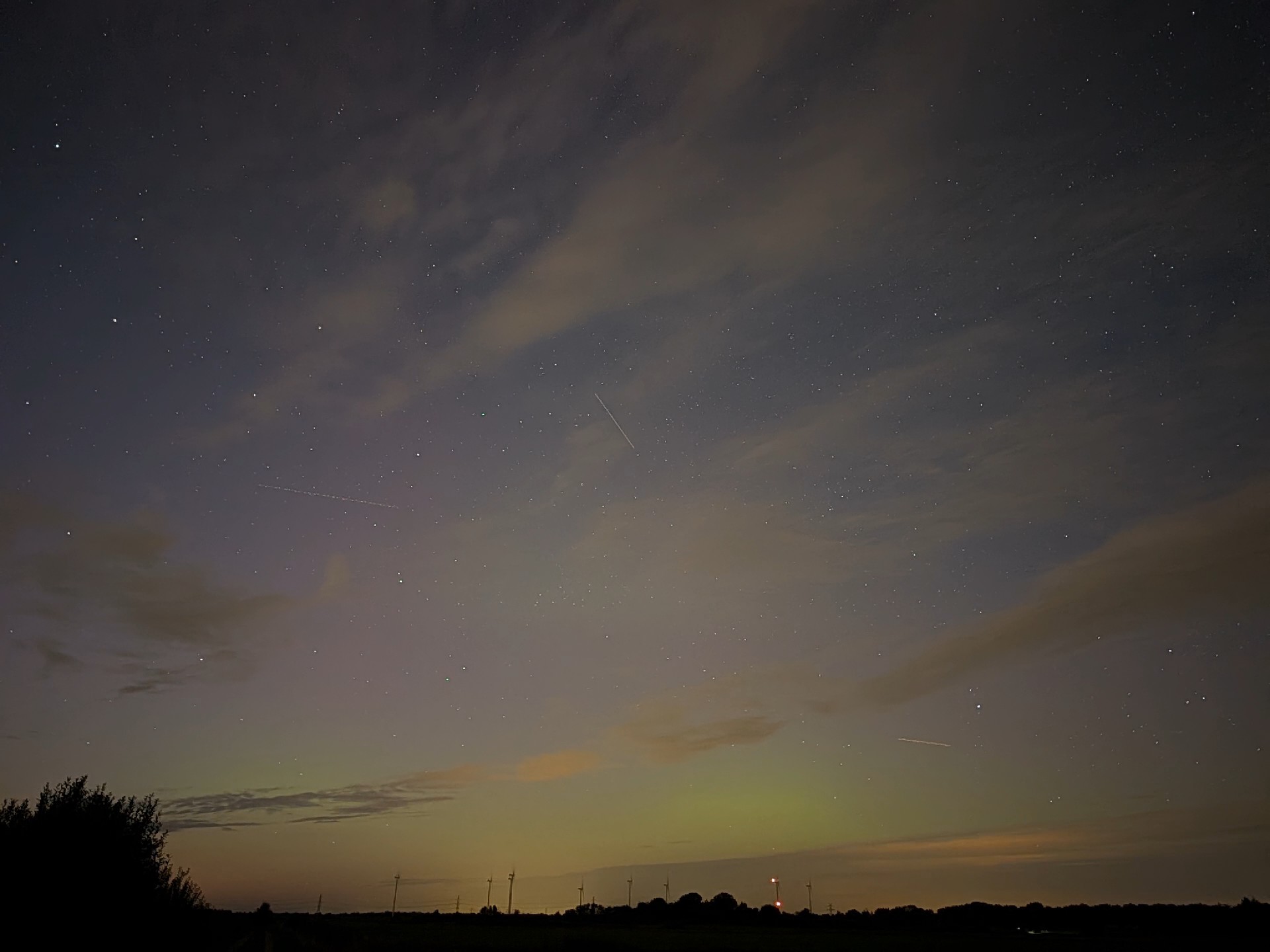 anbei noch meine Beobachtung von der Nacht. Positioniert hatte ich mich auf einem Feldweg östlich von Rellingen, was nordwestlich von Hamburg liegt. Dort konnte ich bereits bei Ankunft gleich Polarlicht nachweisen: Kurz danach wurde der Rotanteil etwas mehr und der grüne Bogen deutlich visuell. Die Strahlen waren zeitweise schwach visuell zusehen. Danach nahm die Strahlenaktivität wieder ab, der grüne Bogen flackerte aber nochmals auf: Im Anschluss glimmte es nur noch und kurz nach 0 Uhr brach ich dann ab.