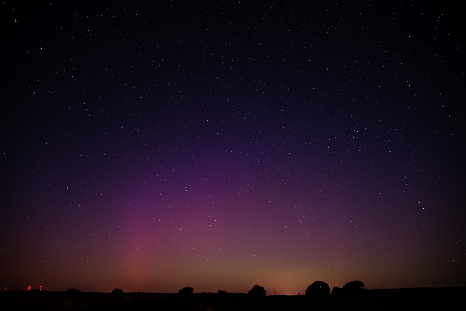 Eilsdorf in Schleswig-Holstein hat fotografisches Polarlicht. Rote und violette Strahlen gehen bis 30° hoch aktuell. Etwas grüner Bogen drunter. Hab aber ein paar Wolkenfelder im Weg.