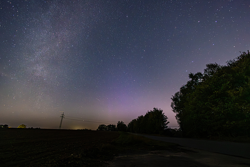 nachdem es die letzte Nacht beruflich nicht ging, konnte ich die Nacht wieder Polarlicht fotografisch festhalten. Eigentlich war ich für Milchstraßenfotos und den Kometen draußen. Der Mond war bereits untergegangen und störte nicht mehr. Positioniert hatte ich mich auf einem Feldweg westlich von Rümpel südwestlich von Bad Oldesloe. Beim Fotografieren der Milchstraße fiel mir Polarlicht auf:
