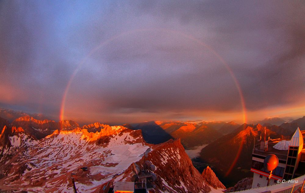 heute morgen konnte ich während SOnnenaufgang an der nahenden Regenfront einen wunderschönen Regenbogen beobachten, der bis nach Ehrwald hinunter reichte.