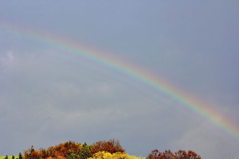 etwa zwei Stunden vorher hatten wir hier im Neckartal noch ein anderes Gewitter. Dieses endete recht abrupt und dann schien die Sonne. Aufgrund des hohen Sonnenstandes (ca. 16:15, Sonnenhöhe 36°) rechnete ich nicht mit einem Regenbogen. Aber dann sah ich ganz schwach den Sekundärbogen sich an den Berghang anschmiegen. Und dann zeigte sich auch tatsächlich noch der Hauptbogen: vor einer solchen Kulisse habe ich ihn noch nie gesehen! Dummerweise hatte ich in diesem Augenblick meine Kamera nicht babei – aber ein Freund hat das Bild dankenswerterweise mit seinem Handy gemacht. Er war sehr eindrucksvoll – dieser Regenbogen auf "Augenhöhe"!