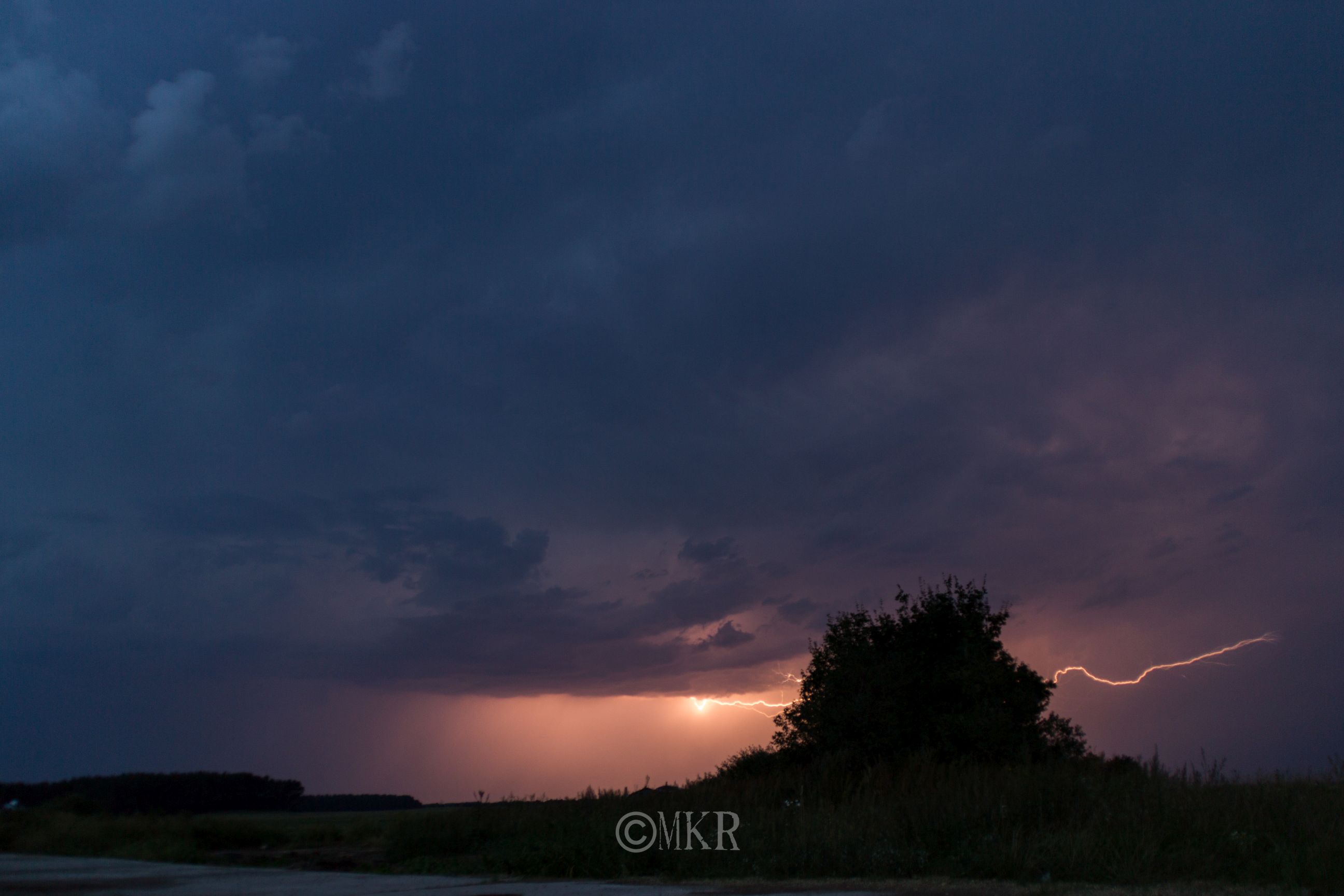 Hier ein negativer Blitz von 22:14:40 MESZ hinter dem Pfälzer Wald, laut Blitzanalyse auf kachelmannwetter.com war der bei Birresborn, ca. 205 km entfernt. An diesem Cluster gab es viele positive Blitze, aber ich habe keinen einzigen Sprite erwischt. Bei der Entfernung von über 200km hätten sie maximal 25 Grad (und bei einer maximalen Entfernung von 400km wohl mindestens ca. 7 Grad, wenn man die Erdkrümmung berücksichtigt) hoch sein dürfen, ich hätte sie also von der Geometrie und Wolkengrenze her auf jeden Fall drauf gehabt, wenn es sie denn gegeben hätte. Die dünnen Cirren sollten nicht stören, nach meiner bescheidenen Erfahrung können Sprites recht hell sein.