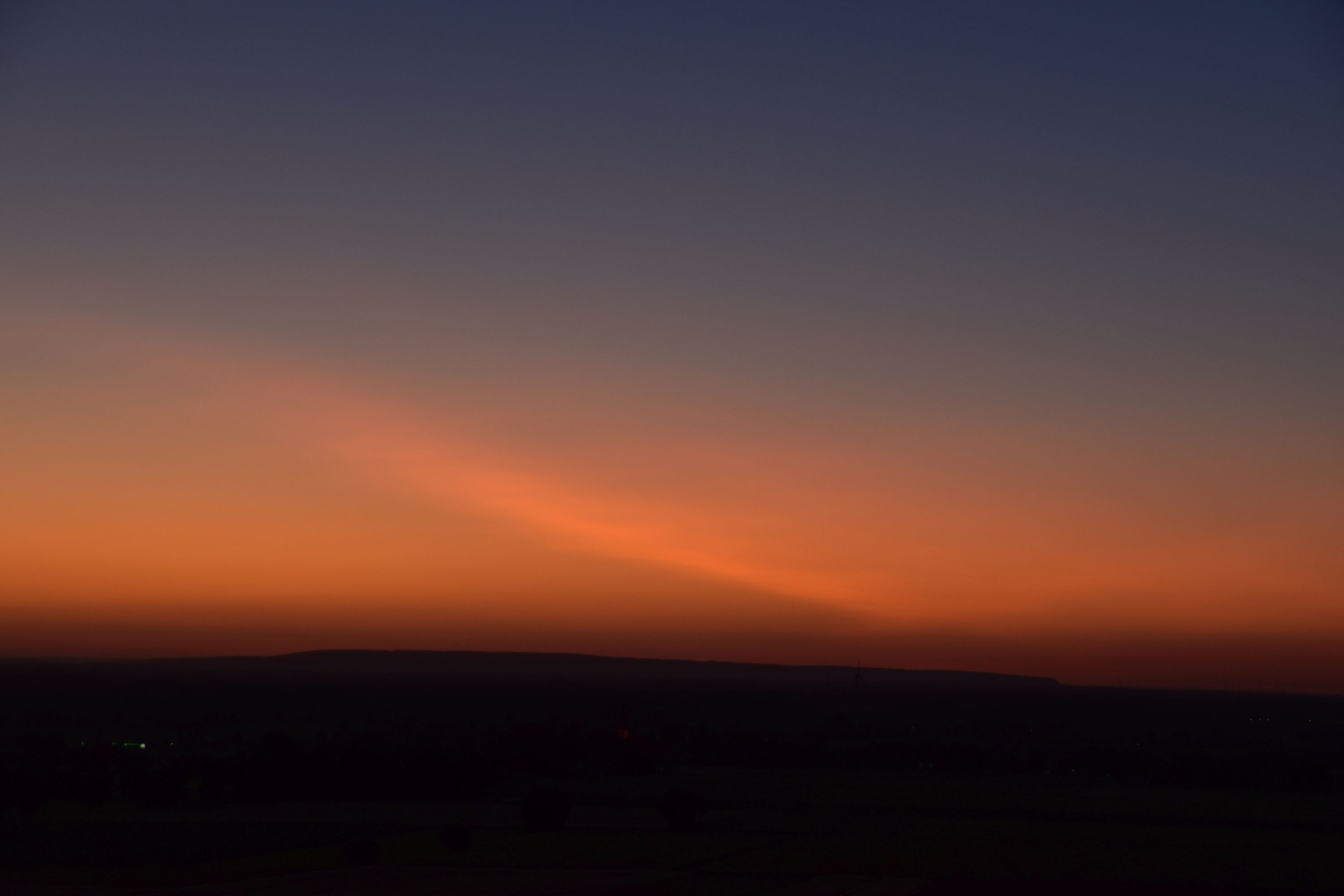 Zu diesem Zeitpunkt war der Dämmerungshorizontalstreifen extrem orange, intensiviert durch das anfangs weiße "Band", darüber stand ein nicht weniger intensives Purpurlicht und der tiefblaue Himmel über mir im Zenit, war auffällig violett durchfärbt. Mit Blick in Richtung OSO, war zuvor eine ausgeprägte Gegendämmerung mit Gegenpurpurlicht zu beobachten. Der Erdschatten hob sich markant ab. Das reinste Farbenspiel.