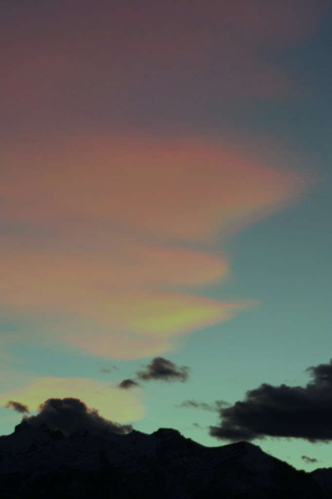 IMG_1883 aufgenommen um 17:04 (~15min nach Sonnenuntergang) IMG_1886 aufgenommen um 17:18 (~30 min nach Sonnenuntergang). Leider etwas unscharf, und die Farbspiele in den Wolken insgesamt schon ziemlich ins Abendrot abdriftend, aber noch immer vorhanden und mit dem blossen Auge gut sichtbar. Wenn man aber mit Bildbearbeitung eine Farbkorrektur vornimmt und die Rottöne stark dämpft (die anderen Farben lassen), dann erkennt man nach wie vor das Irisieren, dass auch mit dem Auge noch stark wahrnehmbar war.
