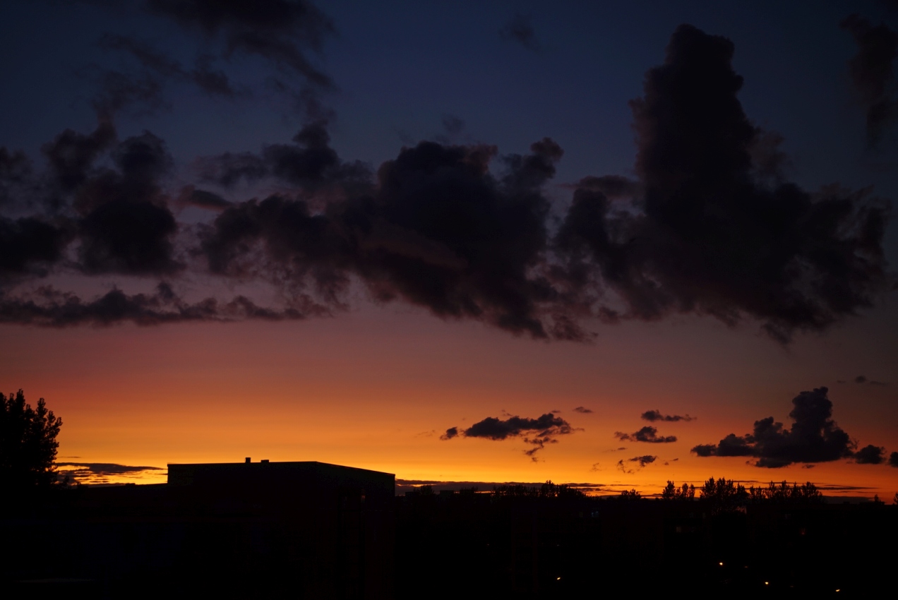 Nachdem ich das gelesen hatte, bin ich mal rausgegangen zum Nachsehen. Hier sah die Dämmerung fast normal aus, nur ein paar Dunstschlieren zwischen vereinzelten kleinen Wolken.