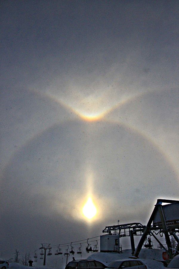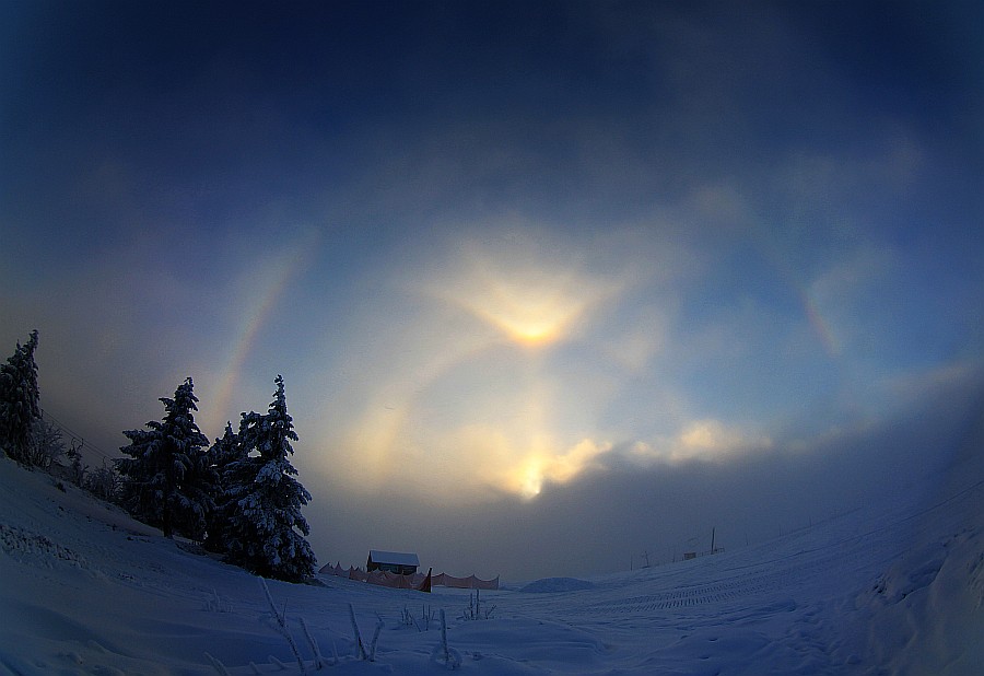 Sehr schön der Schneedeckenhalo: wenn man sich das Bild in groß zeigt und die Eisnebelhalos abdeckt, sieht er hyperbolisch aus (wie Taubögen -> bekannte optische Täuschung).