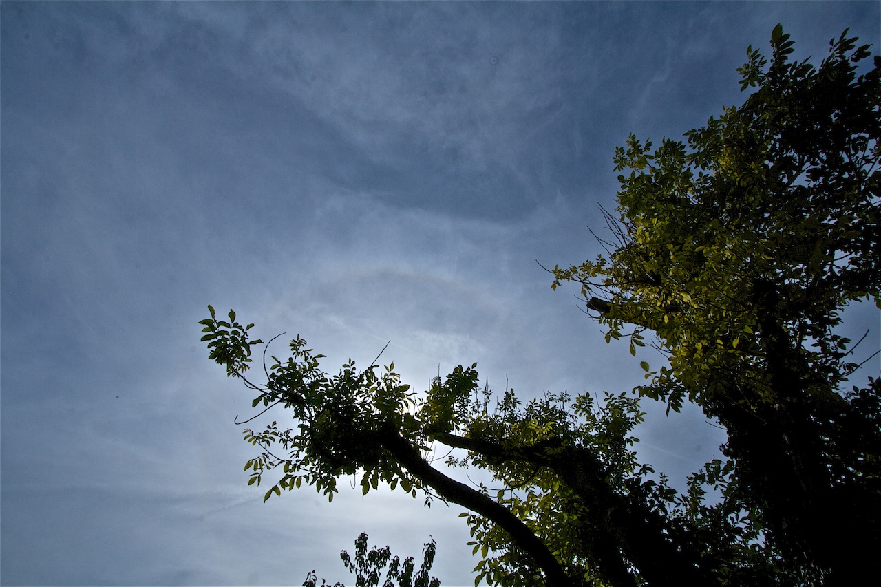 Am Vormittag ging es los mit dem oberen Teil des 22°-Rings und umschriebenen Halos (erstmals gesehen um 11.00 MESZ), später vervollständigte sich der Ring, der untere Teil des umschriebenen Halos und die 22°-Nebensonnen kamen dazu. Also hat mich da der Ehrgeiz gepackt, die Fotos gleich mal auf seltene Arten "auszuquetschen". Hier ein Bild von 14:45 MESZ - schon mit USM und verstärkter Farbsättigung. Darauf erkennt man zusätzlich einen 46°-Ring oder Supralateralbogen: