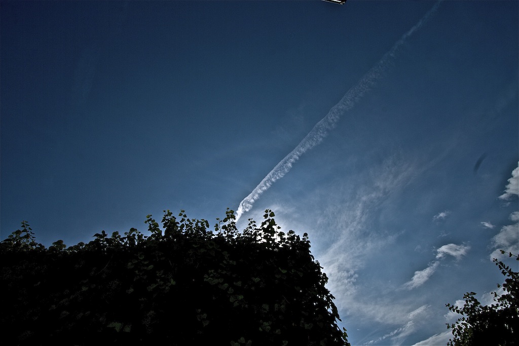 Ein Kondensstreifen mit mehreren Schattenstreifen ausgelöst durch Flug