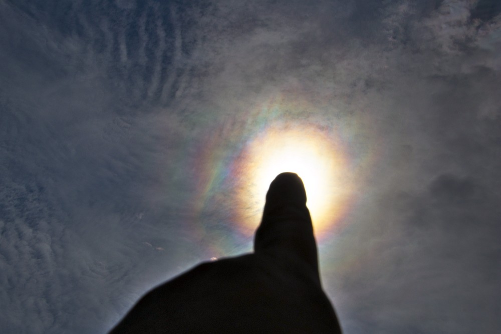 Der zweite begann um 17.10 Uhr bei 28° Sonnenhöhe. Anfangs war er recht diffus, bekam aber recht schnell umwerfende Interferenzen. Trotz gleichzeitig starkem Regen zeigte sich weder auffälliges Zero Order Glow, noch ein Regenbogen 3. Ordnung. Aber er war trotzdem wunderschön ...