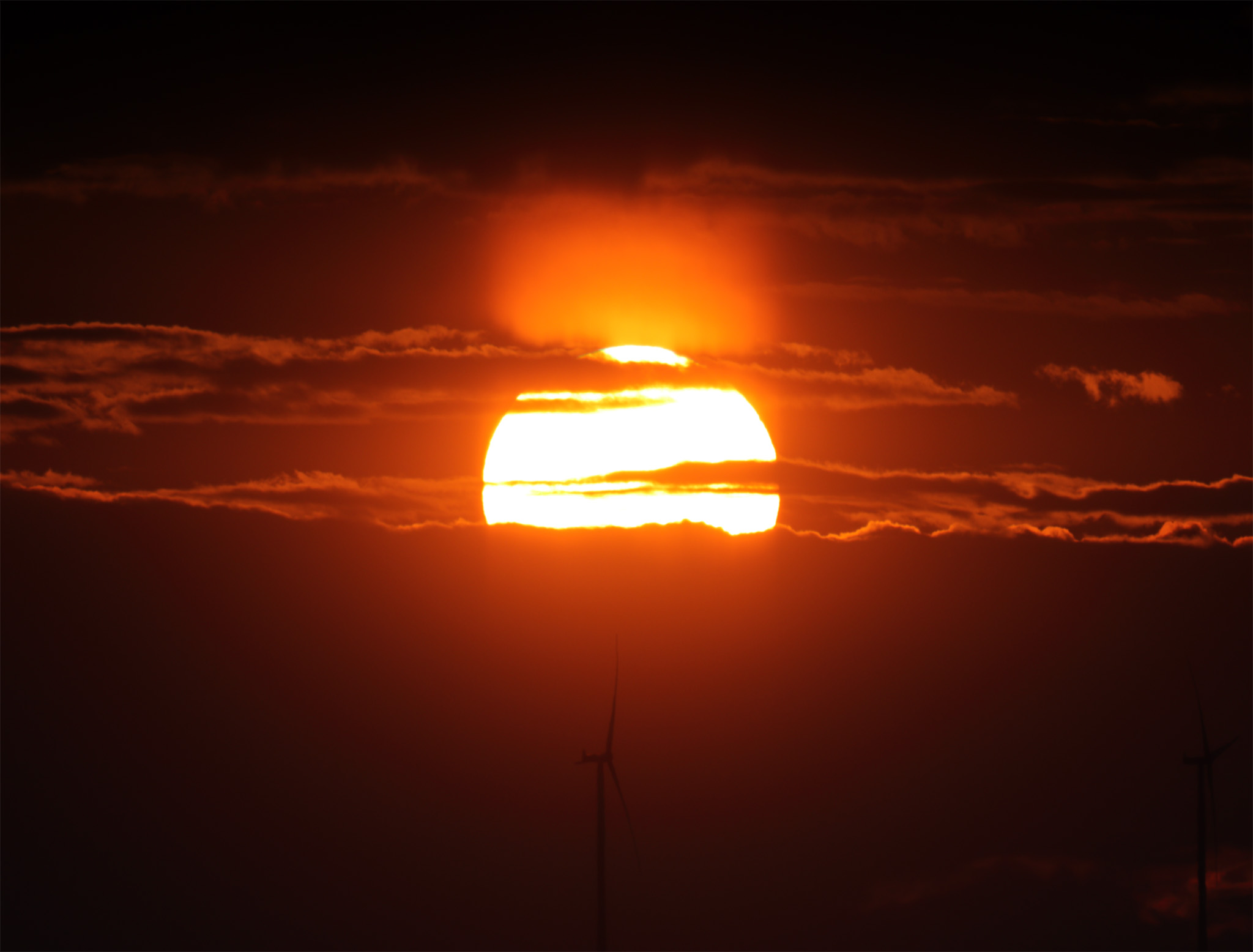 Am 21.4. habe ich den Sonnenuntergang vom Niederrhein aus fotografiert. Ich stand auf einem Hügel, etwa 30 m über der Umgebung (könnte evtl. bedeutsam sein). Von Norden her fiel sehr kühle Luft ein. (ich war zu dünn angezogen). Zunächst sah ich unterhalb der Sonne einen Lichtfleck. Meine erste Idee war eine Reflexion in der Optik, aber ich konnte die "Doppelsonne" auch visuell beobachten. Später wechselte die Erscheinung innerhalb von 60-90 s nach oben. Dort hinterließen Wolken sogar Schatten darauf. Noch später wurde die Sonne von Wolken verdeckt, aber der Lichtpunkt blieb erhalten. Meine laienhafte Interpretation ist die, dass sich die Sonne an einer Luftfläche gespiegelt hat. Erst von oben, dann von unten. Kann das sein? Was ist eure Meinung? Gibt es so etwas öfter? Hat das einen Namen?