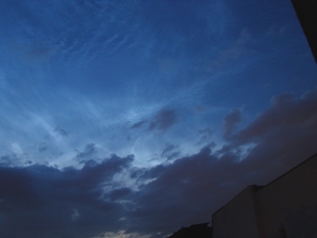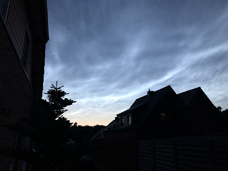 Jetzt verziehen sich die tiefen Wolken auch endlich in Lübeck. Zumindest in Richtung Nordwesten kann ich nun NLCs erkennen. Ja, sie sind hell, 4. Über die Ausdehnung kann ich noch nichts sagen, die Tropo-Wolken behindern den Blick, denn der Rest des Himmels ist nach wie vor dicht.