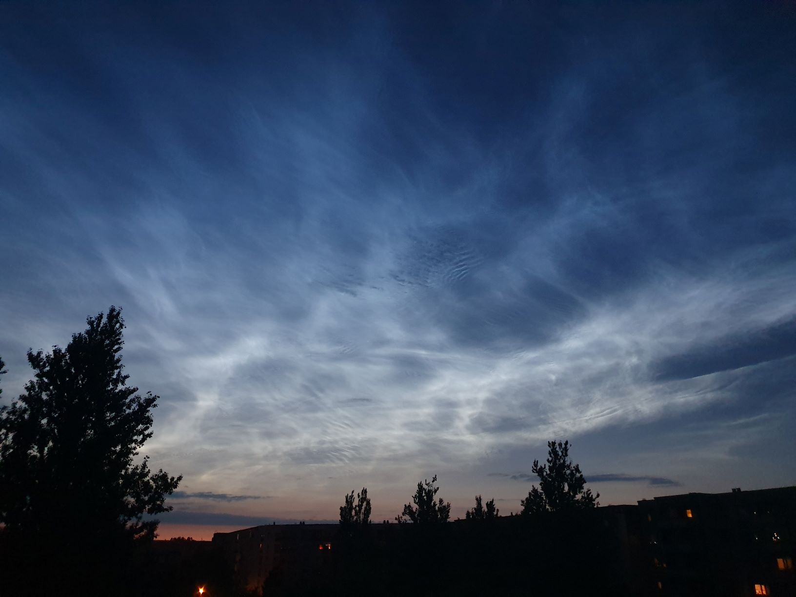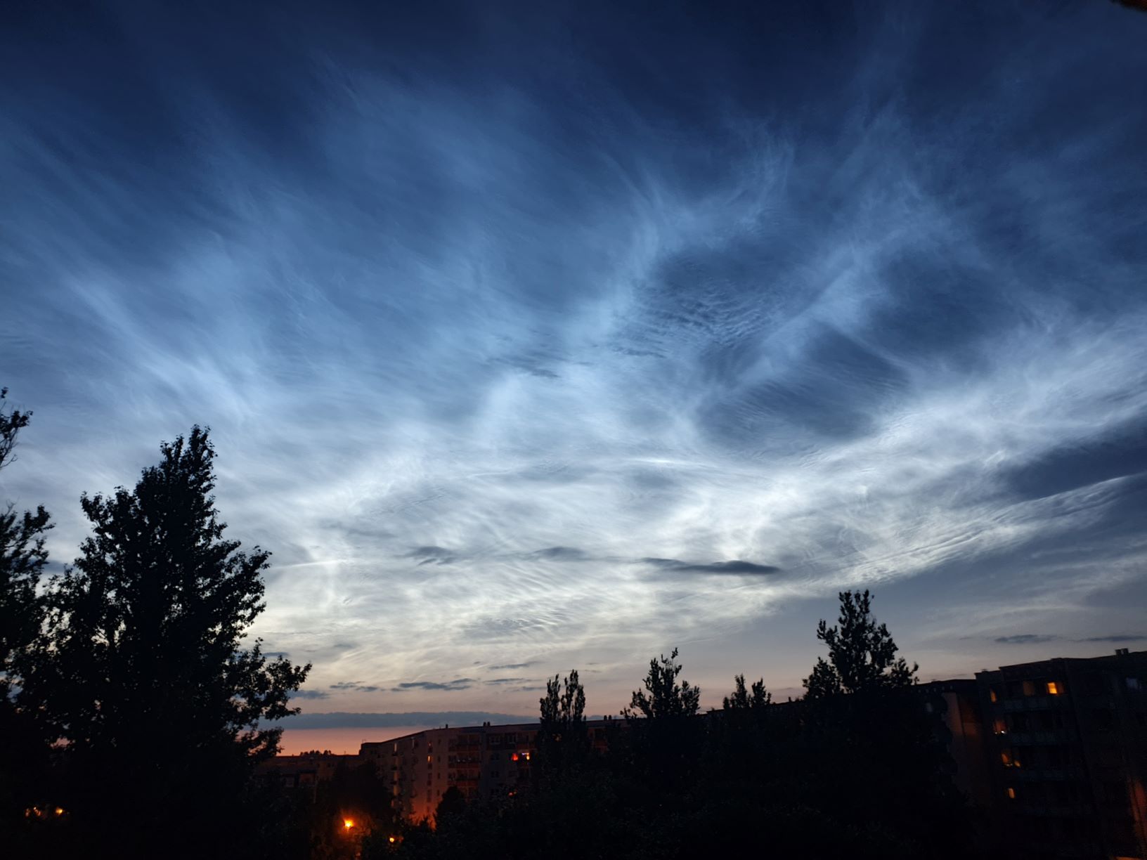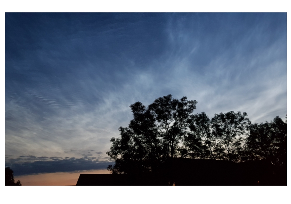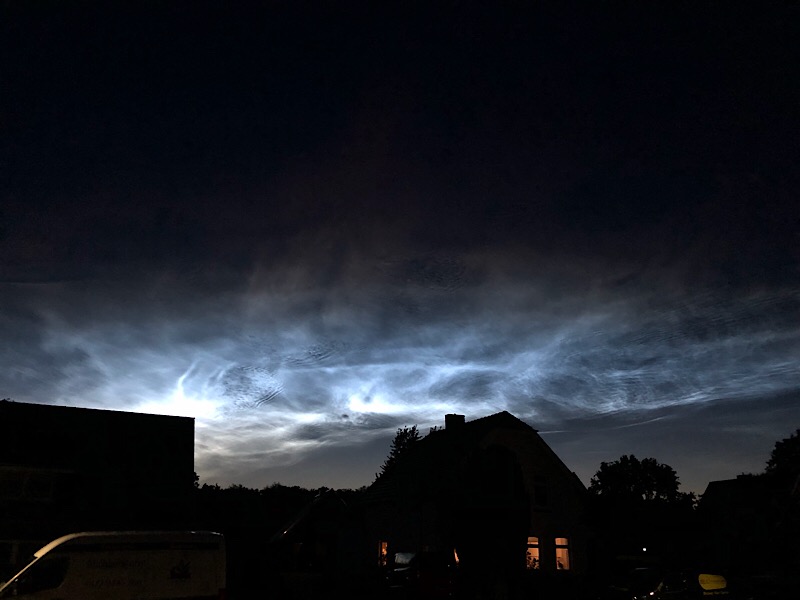 Weiß gar nicht, wie ich meine Fassungsloskeit über das Gesehene beschreiben soll. War auf dem Heimweg und hatte die OSWIN_Daten mitbekommen. Aus dem Frontschreibe des Autos kamen mir um 22:15 MESZ die Cirren dann doch "komisch" vor. Angehalten und dann realisierte ich das Unbegreifliche. Einen mit NLC's bedeckter Himmel. Von Nord nach West und Ost über den Zenit nach Süden!! und das Südlich des 50. Breitengrades. Als ich zu Hause war, machte ich noch paar Bilder. Meine Dashcam hat es auch aufgezeichnet, vielleicht davon später was.