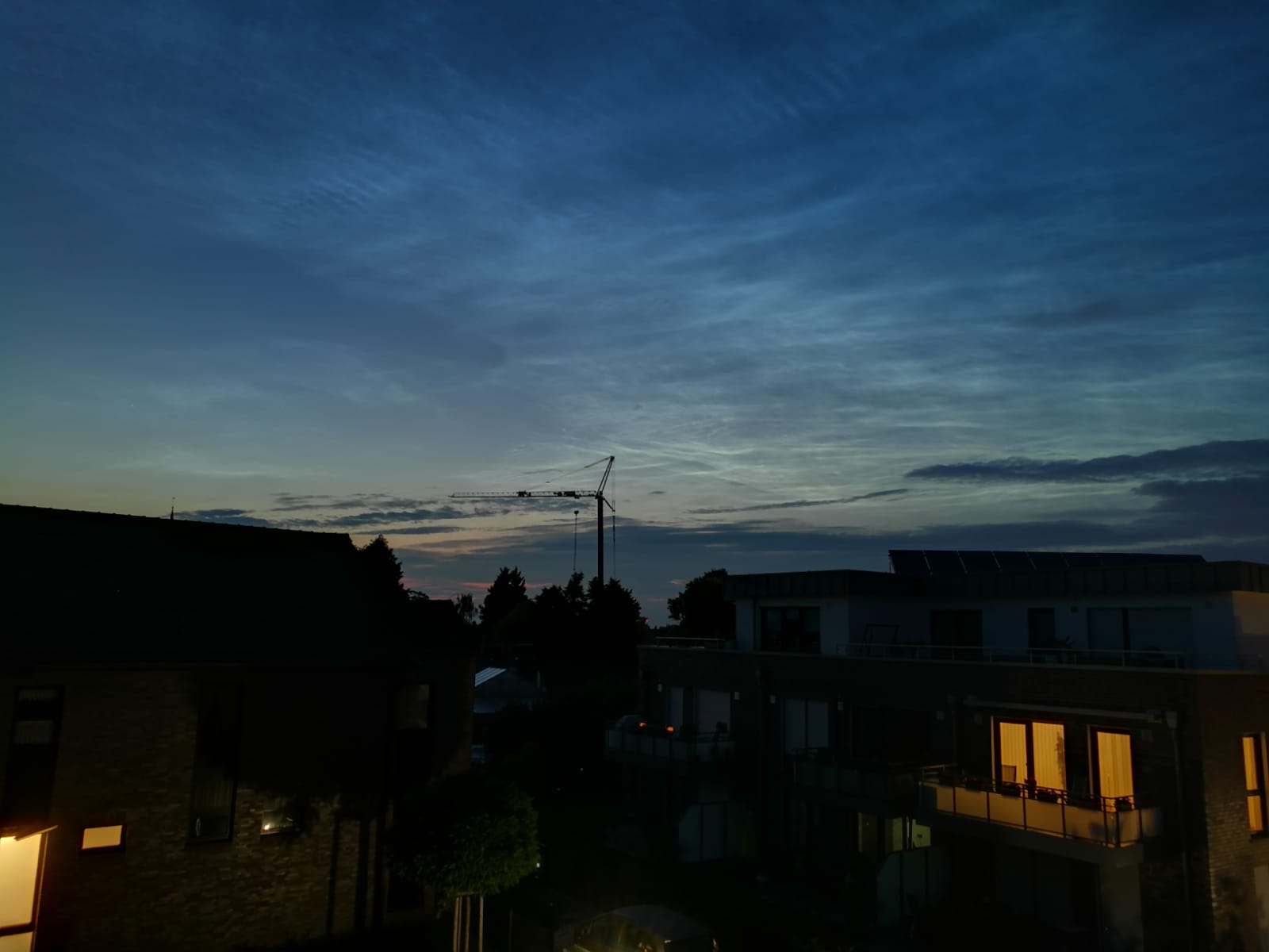 Zu dem Zeitpunkt war das blöde Wolkenfeld noch im Weg, und ich hatte keine Ahnung, dass die schmalen Streifen in Wirklichkeit nur das untere Ende von einem riesigen NLC-Feld waren- bis mir der Lieblingsmensch (wohnt in Kaarst am Niederrhein) mir diesen Schnappschuss (Handyfoto, die Kamera war nicht greifbar) geschickt hat: