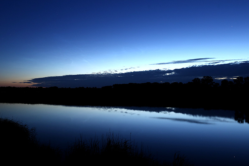 Nach leckerem Picknick auf dem Steg im See begab ich mich auf Dorf-Erkundung. Jupiter und Saturn schwebten prachtvoll über rustikalen Feldsteinscheunen, am Dorfteich sangen die Dorfteichfrösche, alle Dorf-Igel und Dorf-Katzen wurden begrüßt. Gegen 2Uhr MESZ wieder zurück am See, sah die NLC-Situation im Morgensektor ähnlich wie am Abend aus. Die Höhe des Abends wurde (visuell) nicht mehr erreicht. Hinsichtlich Helligkeit waren sie morgens visuell deutlich schwieriger als am Abend auszumachen. Noch gerade so eine knappe "1".