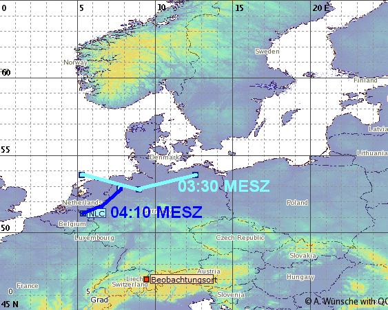 Die einzige gesicherte menschliche Beobachtung kam von Simon aus dem Raum Leipzig. Dort wie auch an vielen Webcams war die Ausdehnung des Displays auf Grund der troposphärischen Bewölkung kaum nachvollziehbar. Deutlich bessere Bedingungen herrschten am Standort der hochgelegenen Alpen-Cam in Pizol. Die Vermessung zweier Frames von 03:30 MESZ und von 04:10 MESZ dokumentiert eine beachtliche Dynamik des NLC-Feldes (Abb. 2), welche sich auch bei der schnellen Durchsicht aller Frames zwischen 02:30 und 04:50 MESZ sehr schön zeigt.