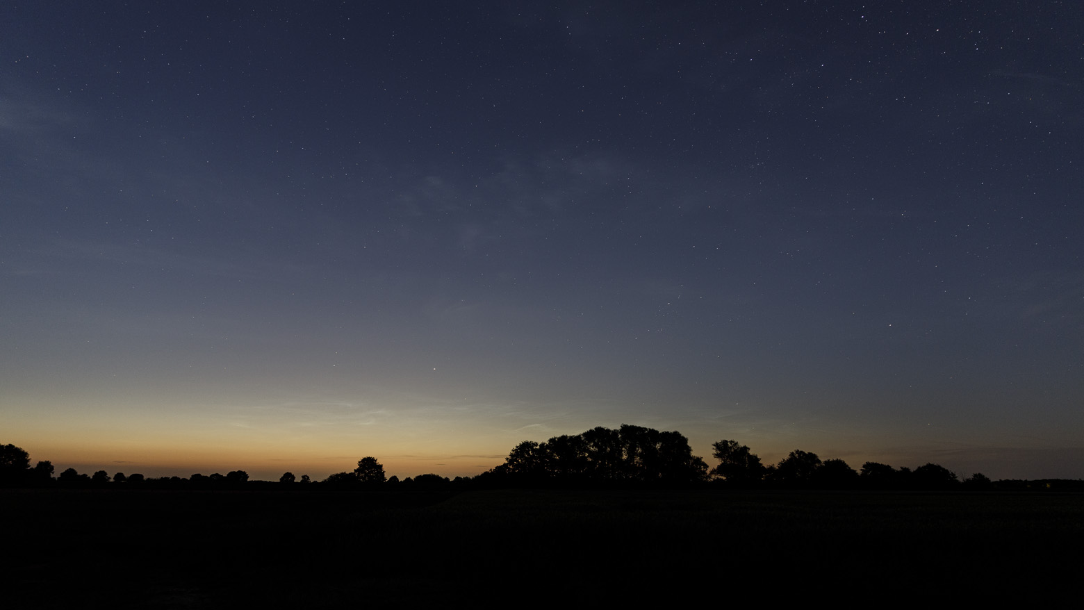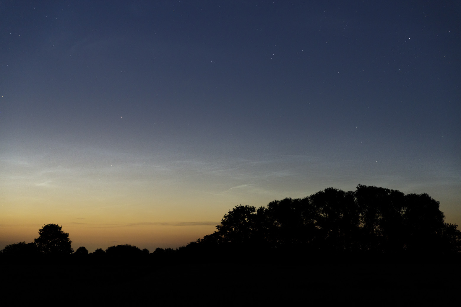 Die NLCs waren an meinem Standort die gesamte Nacht nachweisbar. Hier eine Aufnahme rund um die astronomische Mitternacht, Sonnenstand bei -14,4°: