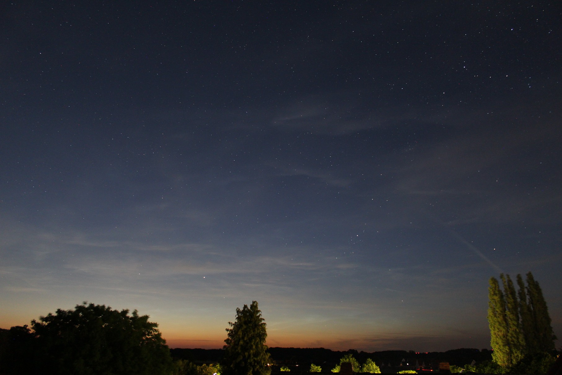 Allerdings musste ich reichlich lang warten, bis sich etwas tat. Erst kurz nach Mitternacht konnte ich eine leichte Aufhellung Richtung Norden wahrnehmen, die nicht mehr von den Cirren zu stammen schien. Also habe ich doch noch die Kamera herausgeholt und eine Testaufnahme gemacht. Ja, da war irgendwas. Gleichzeitig kam dann auch von Stefan die Frage über den Chat, ob da was sein könnte. Nach einigen Minuten war es dann klar, NLC. Ganz schwach und tief am Himmel, aber NLC!