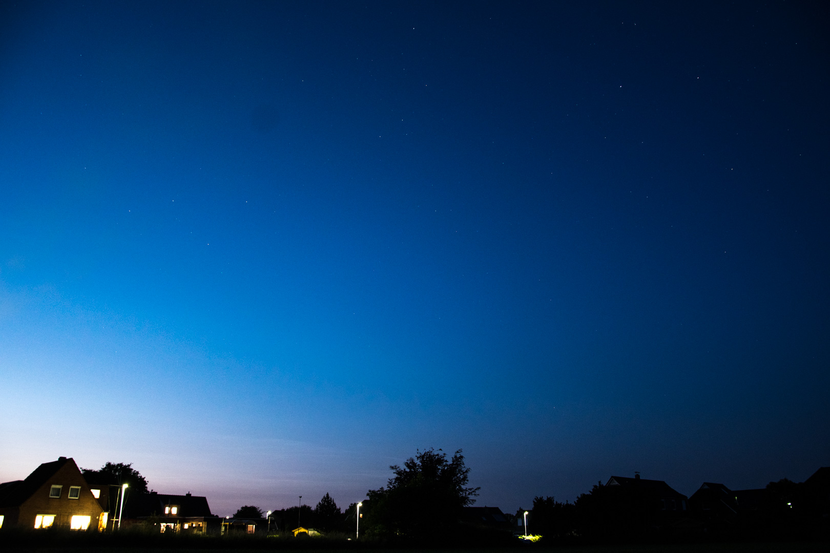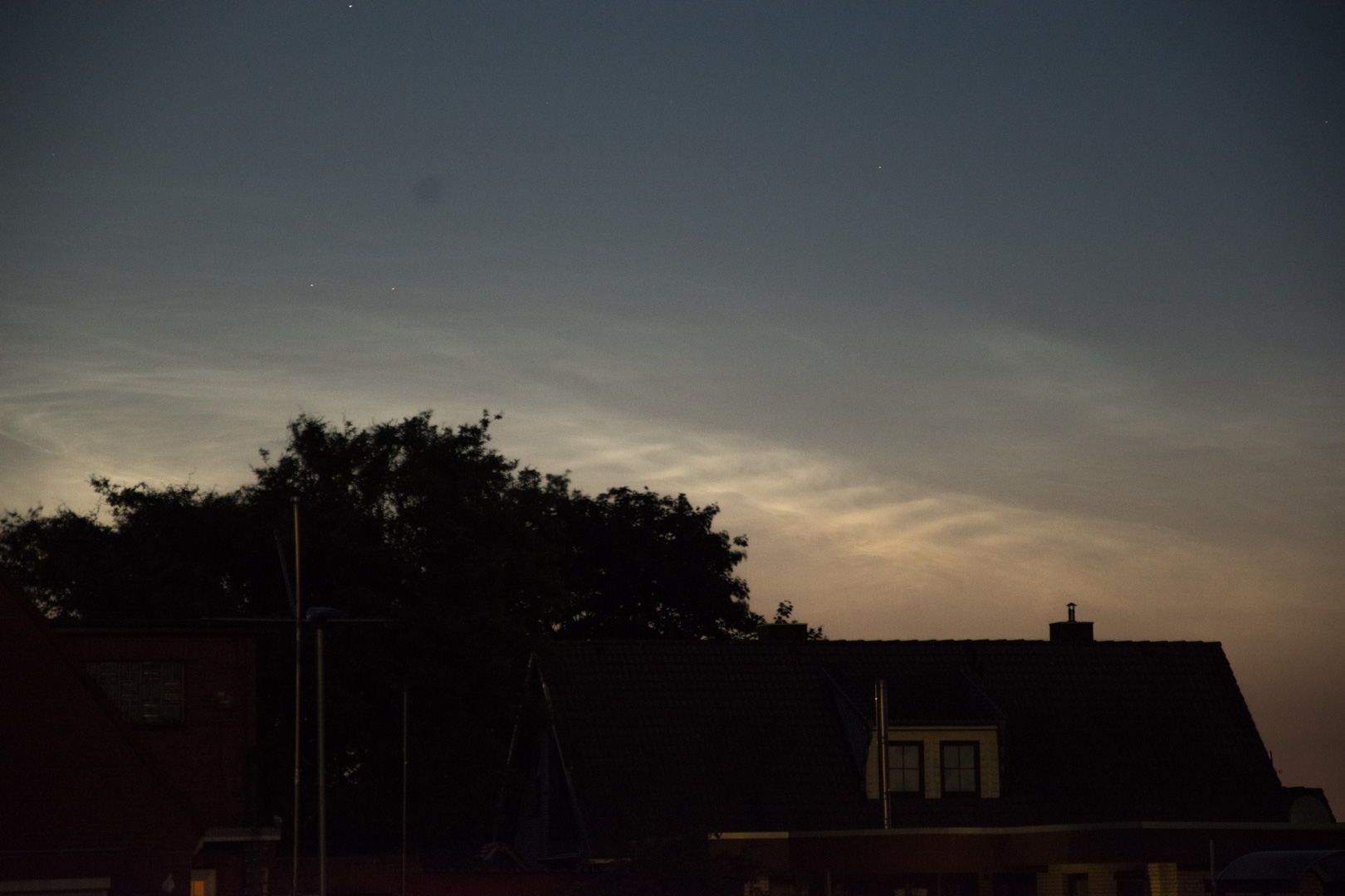auch von Wardenburg aus ließen sich die ersten NLC dieses Jahres - zumindest fotografisch - nachweisen. Der Dunst Richtung Norden war schon deutlich wahrzunehmen, sodass die NLC es entsprechend schwer hatten. Im Weitwinkel ist von den NLC nichts auszumachen. Erst bei 70 mm Brennweite heben sie sich gegen die Dämmerung ab.