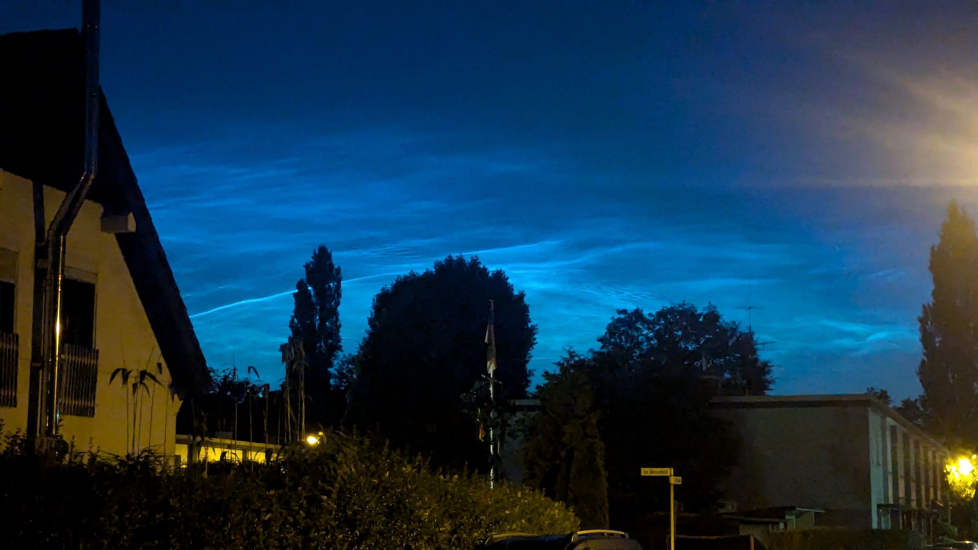 Aus Idstein kann ich besonders helle NLCs seit einem Sonnenstand von -5,5° vermelden, die durch Schleierwolken hervorstachen. Höhe bis ca. 30°.