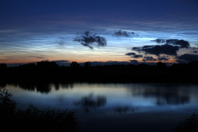 Leuchtende Nachtwolken aus Greifswald vom Ryck aus betrachtet. Das erste gute Display ohne massive Bewölkung in dieser Saison. Dabei gab es heute Nacht nur eine kurze Aufklärung, die hat aber schon gereicht. Ein wunderbares Erlebnis in einer wunderbar stillen und angenehm warmen Nacht. Helligkeit etwa 4-5. Die Saison kommt wohl doch noch in Fahrt.