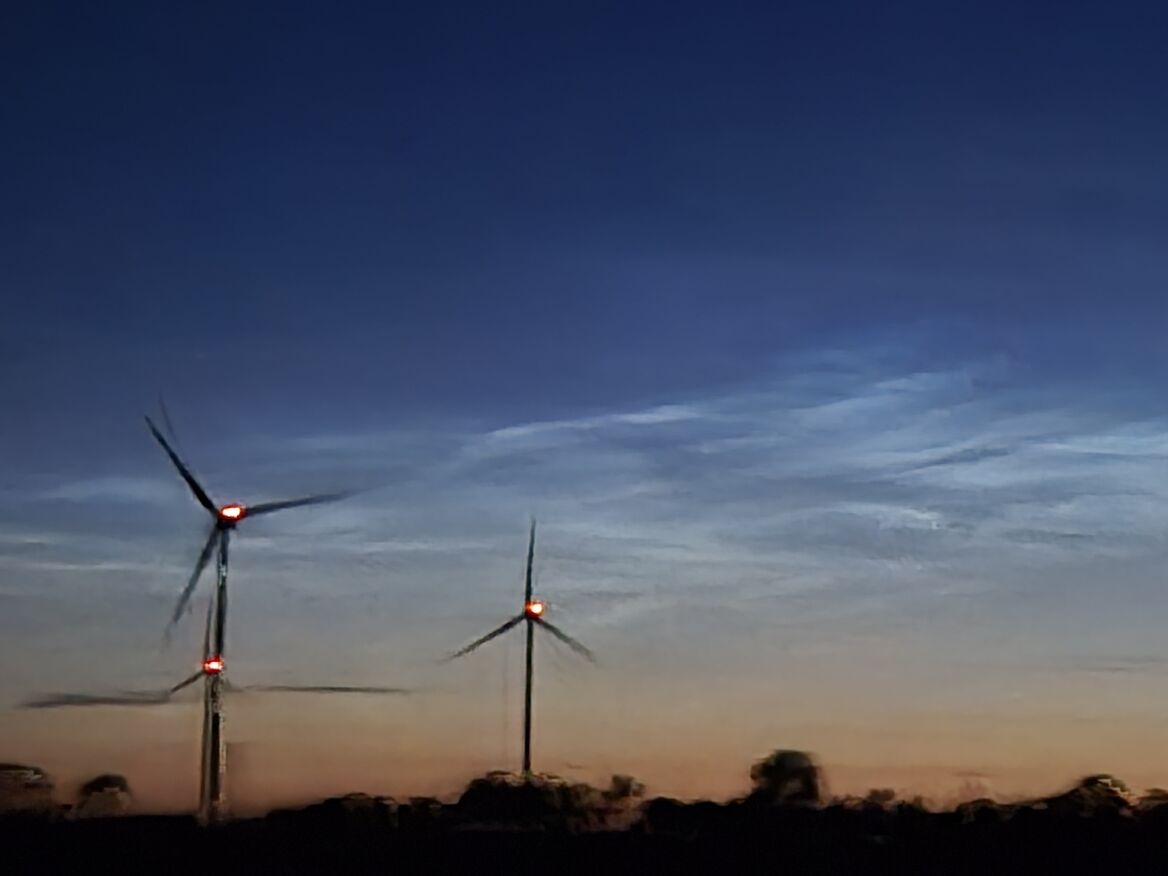 nachdem es sich bei den nach 23:30 MESZ an der Lindenberg-Cam gesichteten verdächtigen Strukturen wohl eher um troposphärische Wolken gehandelt hatte, sind jetzt dort sowie an weiteren Cams im NE eindeutig NLCs sichtbar: