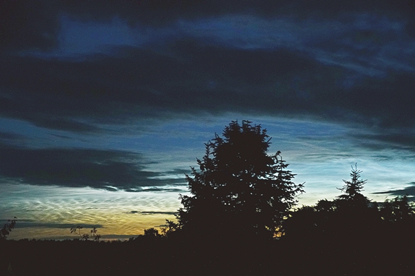 Die niedrigen Wolken am oberen Bildrand verdeutlichen den starken Schein der NLCs im Dämmerungsbogen: Auch visuell wirkte die Szenerie zeitweise so, als würde der volle Mond am Horizont aufgehen und sein Licht auf die Landschaft werfen.