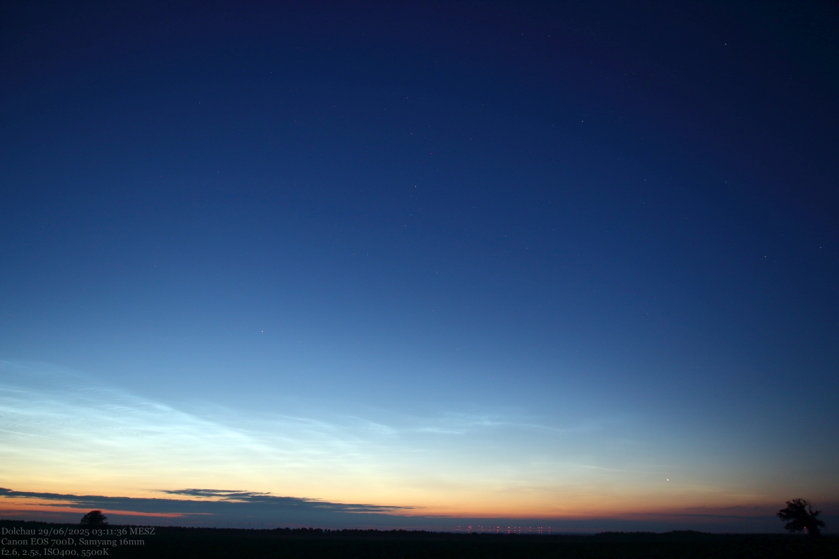 aufgrund Wetter und Arbeit kann ich erst heute meine erste NLC-Sichtung für 2025 melden. Eigentlich hatte ich auch diesmal nicht mit einer Sichtung gerechnet, aber irgendwie muss es in den Abendstunden aufgeklart haben