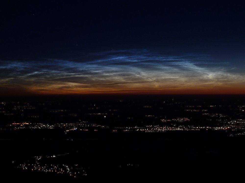 Das war meine erste NLC Sichtung überhaupt und kam fast nur aus Zufall zustande, denn um in Richtung Nordwest bis Ost zu schauen, muss ich hier erst einmal einen Berg hinauf. Das sind so circa 150 Meter (hab nämlich noch keinen Autoführerschein). Ohne Stativ Kamera, Objektive usw. wäre das sicherlich ok aber mit dem Fahrrad und dem Equipment ist das nicht so angenehm. Habe für so etwas eigentlich nicht jeden Tag Lust und Zeit und da ich zwei Tage zuvor bei guten Bedingungen keinen Erfolg hatte war ich nicht wirklich motiviert. Allerdings sahen an diesem Abend viele Informationen für NLCs vielversprechend aus und das Wetter war auch mehr als nur perfekt. Die Temperaturen lagen an diesem Abend um die 17 Grad und es war fast klar mit guter Sicht. Oben angekommen war erstmal nicht viel zu sehen, ein paar einzelne Cirren waren bereits dunkel ansonsten alles wie gehabt. Erst nach ein paar Minuten, bei genaurem Hinsehen, sah man ein paar einzelne Linien die sich deutlich vom dunklen Cirrus unterschieden. Ab hier war ich mir sicher das sich um keine normalen Wolken handelt, sondern um die ersten NLCs meines Lebens.