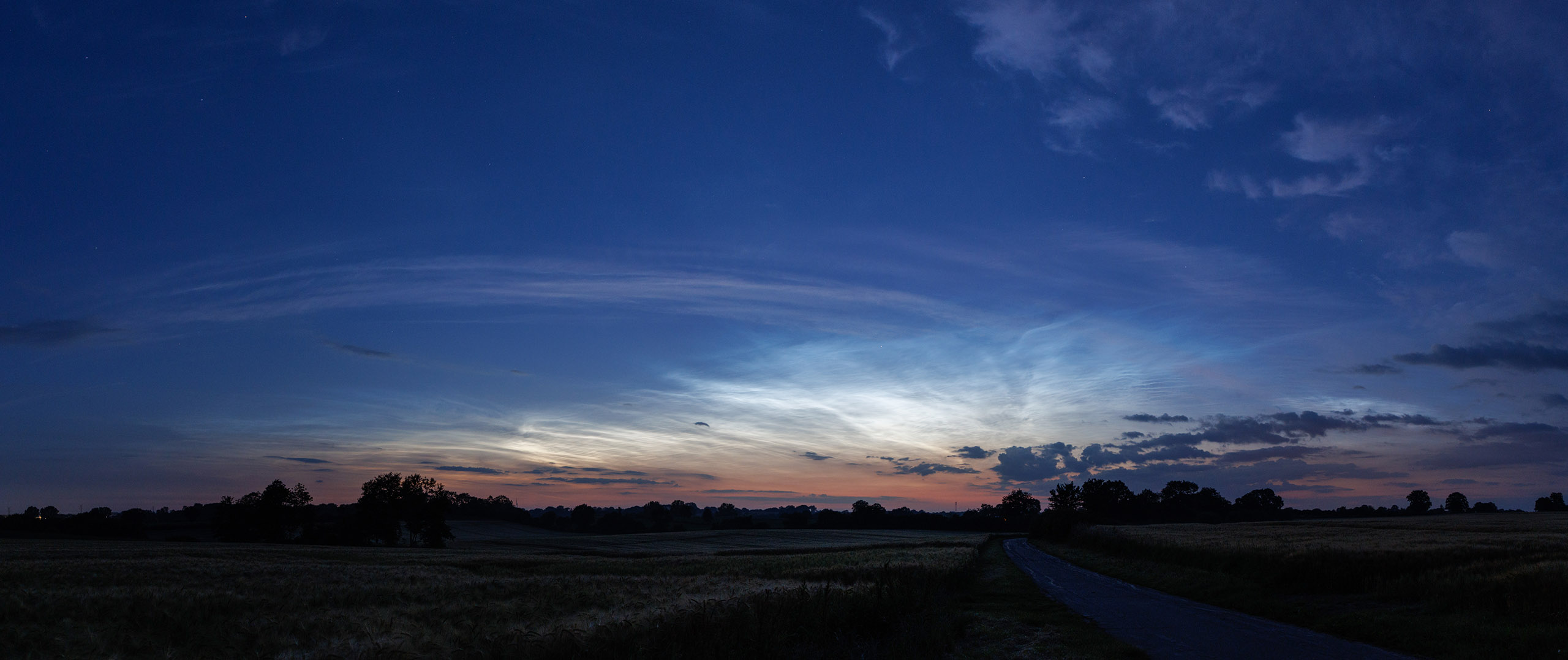 Zu dem Zeitpunkt erstreckten sich die NLC von 330° bis ca. 75° Azimut und bis ca. 20° Höhe. Die Helligkeit betrug 4-5. Jedenfalls konnte ich meinen diffusen Schatten auf dem Feldweg erkennen.