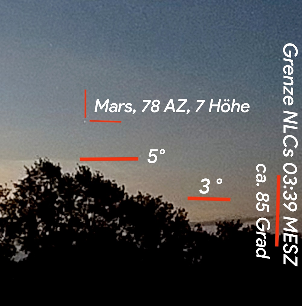 Die NLC erreichten allmählich eine größere Höhe, weil sie sich anscheinend von Nordost nach Südwest bewegten und auf uns zu zogen. Um 3:26 MESZ reichten sie schon bis 50° hoch und horizontal bis in den Osten.