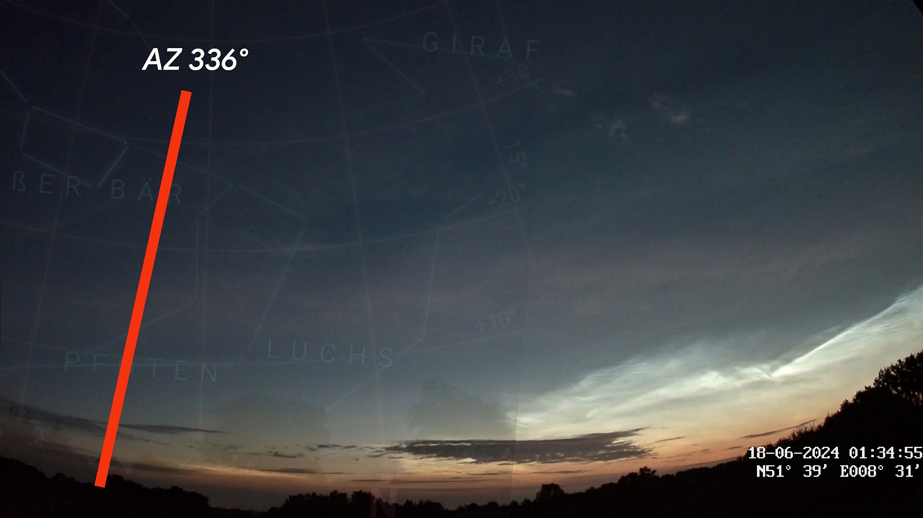 in Oberursel lieferten die NLCs am Morgen des 18.07.2024 eine eher bescheidene Vorstellung ab Wir haben sie ab 03:50 MESZ beobachtet; bereits gegen 04:05 MESZ waren sie weitgehend in der Morgendämmerung verblasst. Der für uns einsehbare Abschnitt des Displays erstreckte sich parallel zum Horizont in 11° Höhe von Az. 30° bis Az. 75°. Die Helligkeit lag zunächst bei 3 und nahm dann rasch ab.